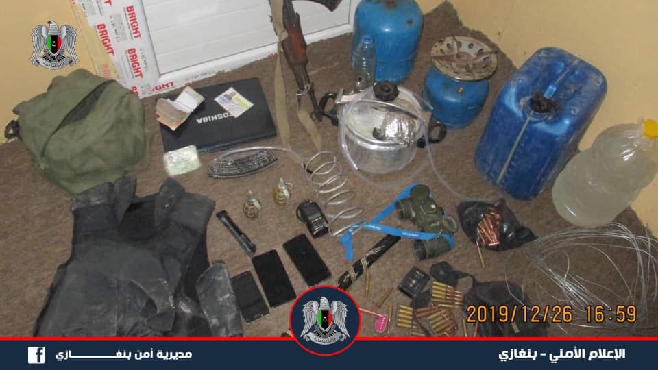 ضبط قسم البحث الجنائي بمديرية أمن بنغازي مصنعا لصناعة الخمور من قبل اعضاء بنطاق المدينة الرياضية.