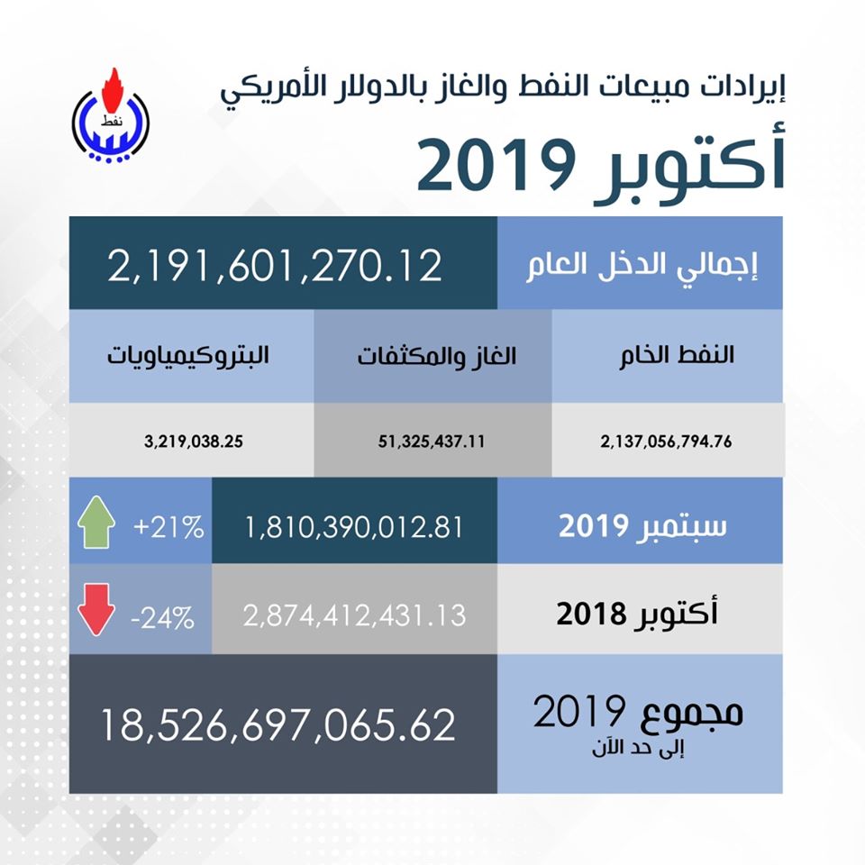 علنت المؤسسة الوطنية للنفط أنّ إيرادات شهر أكتوبر 2019 بلغت حوالي 2.2 مليار دولار أمريكي- بارتفاع قدره 381 مليون دولار بنسبة 21% مقارنة بإيرادات شهر سبتمبر 2019.