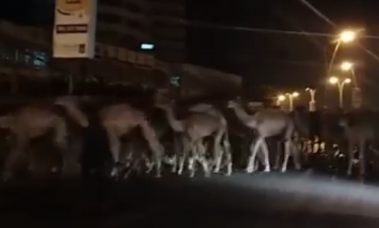 أظهرت صور ومقاطع فيديو تم تداولها عبر مواقع التواصل الاجتماعي في ليبيا، عشرات الإبل تتجول في شوارع طرابلس، بالقرب من ذات العماد.