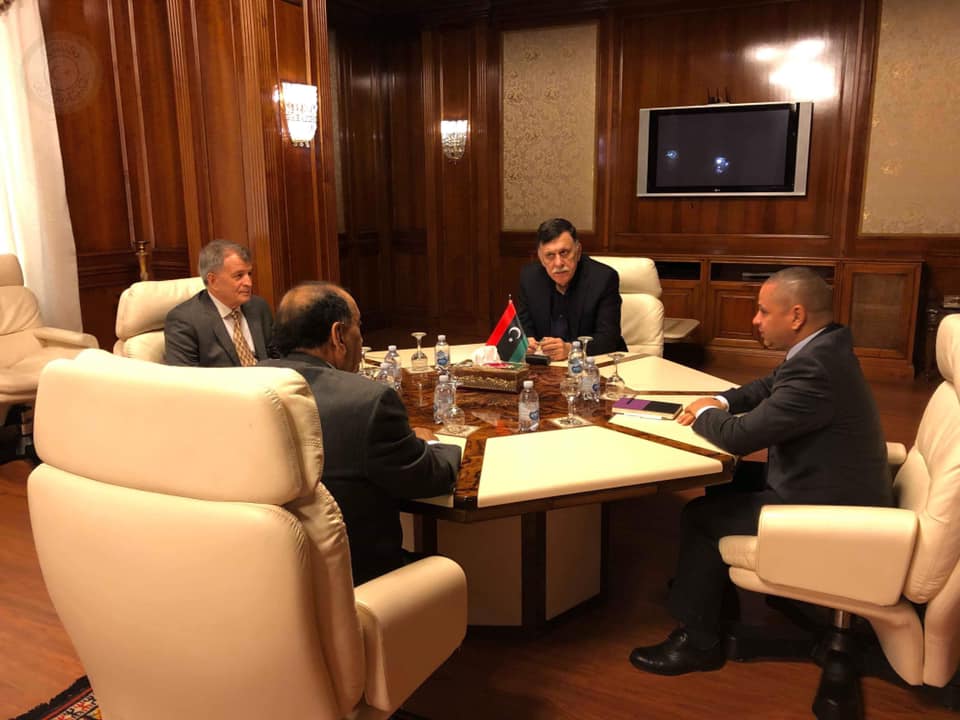 لتقى رئيس المجلس الرئاسي لحكومة الوفاق فائز السراج مع رئيس المؤسسة الليبية للاستثمار علي محمود، ورئيس مجلس إدارة الشركة الليبية للاستثمارات الخارجية مصطفى الخطاب .
