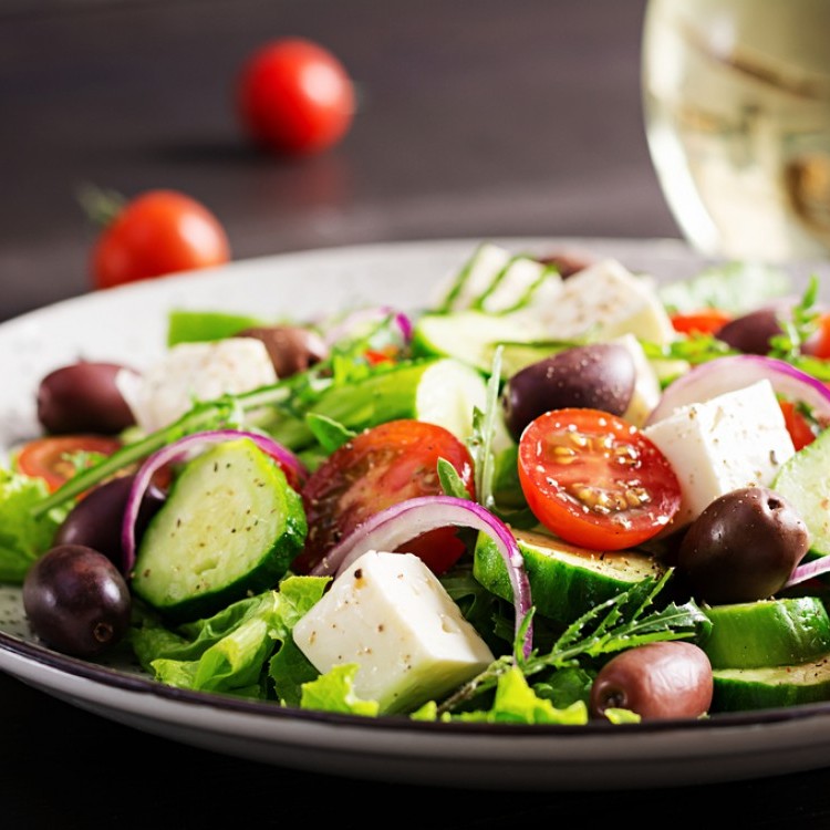 ضعي الخس والبصل والزيتون والفلفل الأخضر والخيار والطماطم المفرومة في وعاء وقلبي المكونات.