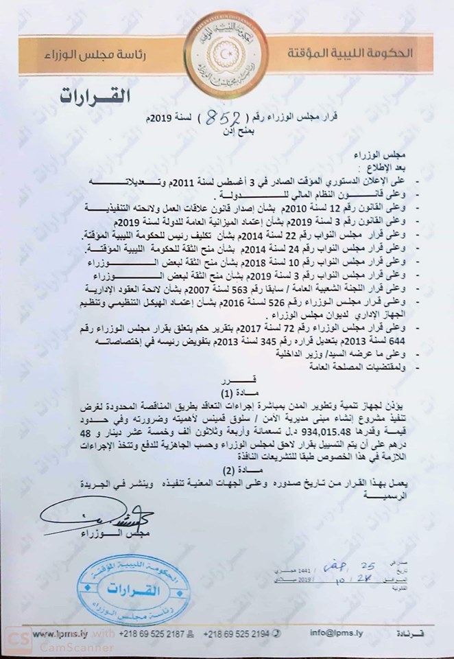 اصدر مجلس وزراء الحكومة المؤقتة القراررقم 852 لسنة 2019 والذي يقضي بإنشاء مبنى مديرية أمن سلوق قمينس، بكلفة تقدر بـ934 الف دينار.