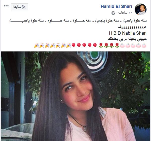 وجه الفنان الليبي ​حميد الشاعري​ معايدة لابنته في يوم عيد ميلادها، فنشر عبر حسابه على أحد مواقع التواصل الإجتماعي صورة لإبنته نبيلة، وعلق عليها:”سنة حلوة ياجميل – سنة حلوة ياجميل – سنة حــــــلوة – سنة حـــــــــلوه – سنة حلوة ياجميــــــــــــل، هووووووووووووف حبيبتي يانبيله – ربي يحفظك”.