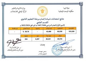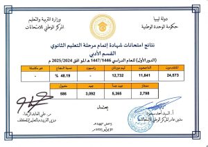 أما بالنسبة للطلبة الليبيين بالخارج، فقد بلغت نسبة النجاح في شهادة التعليم الأساسي 83.21%، بينما حقق طلاب القسم العلمي في التعليم الثانوي نسبة نجاح بلغت 70.12%، فيما وصلت النسبة في القسم الأدبي إلى 94.21%.