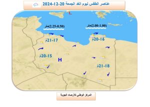 أفاد المركز الوطني للأرصاد الجوية بتكاثر السحب، اليوم الخميس، مع احتمال سقوط أمطار خفيفة على بعض مناطق الشمال الشرقي، بما في ذلك سرت.