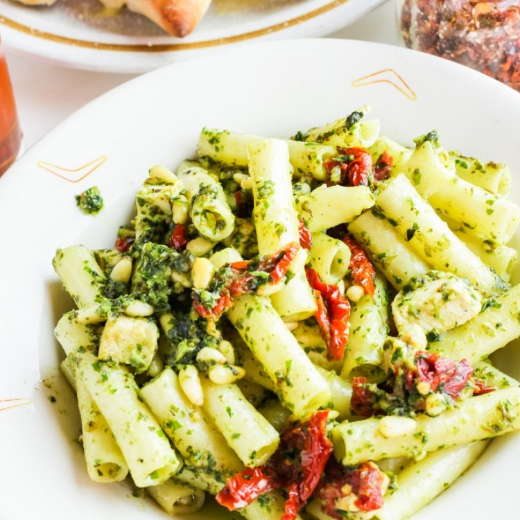 ضعي الباستا في طبق وأضيفي الدجاج وصلصة البستو والطماطم المجففة وحركي المزيج وقدميها ساخنة.