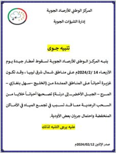 حذر المركز الوطني للأرصاد الجوية، من سقوط أمطار جيدة على مناطق الشمال الشرقي يوم الأربعاء المقبل، تكون غزيرة أحيانا على مناطق الخليج وسهل بنغازي والمرج والجبل الأخضر ودرنة.