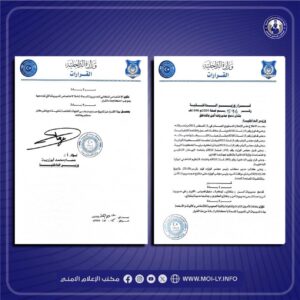 أصدر وزير الداخلية بالحكومة الليبية، عصام أبوزريبة، عددا من القرارات لتقليص عدد مديريات الأمن التابعة للحكومة، من 37 مديرية إلى 16، في المنطقتين الشرقية والجنوبيةفي اطار تطوير العمل الأمني بالشكل الذي يتماشى مع الاحتياجات الراهنة وتعزيز الأمن والسلامة ، وذلك على النحو التالي:-
