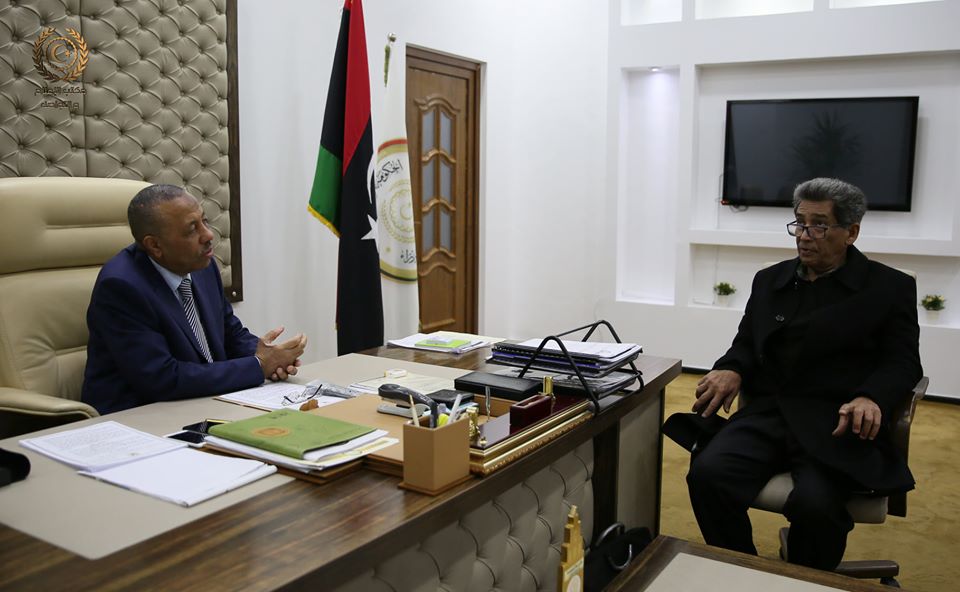 بحث رئيس وزراء الحكومة المؤقتة عبدالله الثني مع نائبه لشؤون الخدمات د.عبدالسلام البدري عددا من الملفات الخدمية خلال اجتماع عٌقد في ديوان مجلس الوزراء في منطقة قرنادة.