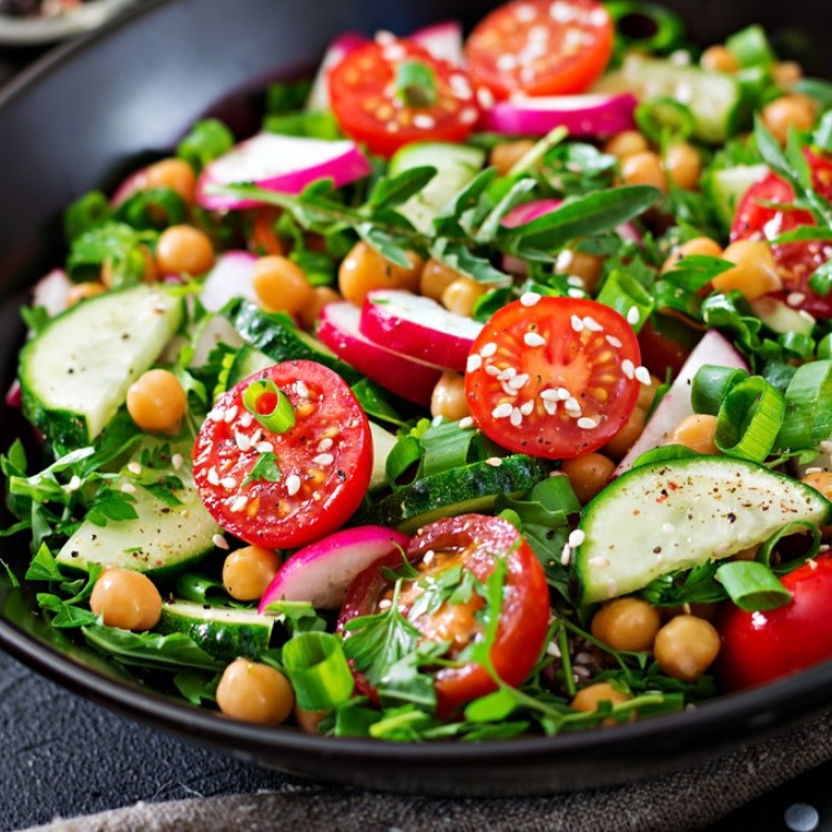 1. اخلطي الخيار والفجل والطماطم والجرجير والحمص في وعاء عميق.