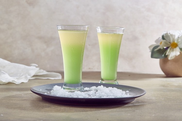 - يُضرب المكوّنان حتّى يتشكّل سائل، فيُضاف كوب من مكعبات الثلج، وكوبان من الماء مع الاستمرار في الخلط حتّى الوصول إلى القوام المرغوب للـ”العصير”، الذي يُقدّم باردًا.