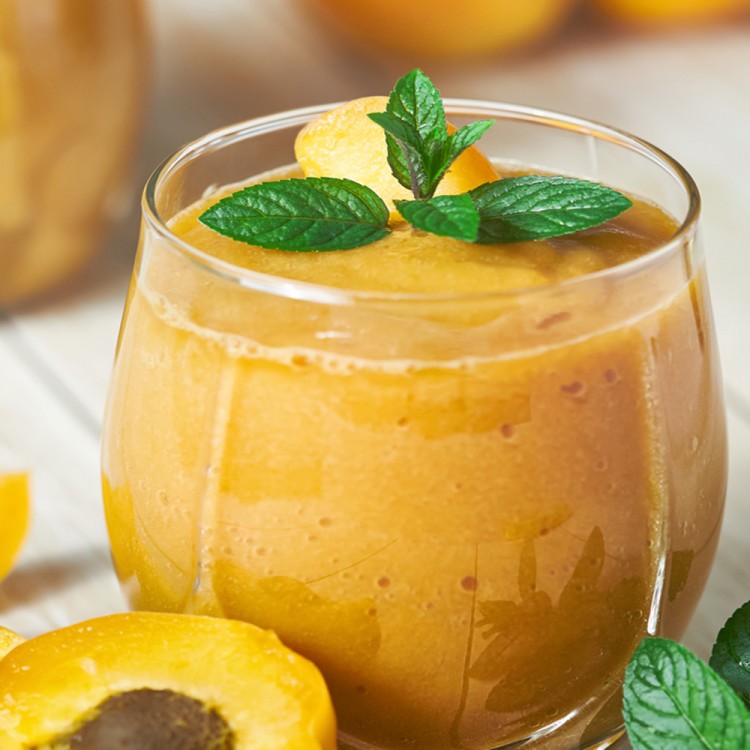 1. اخلطي المشمش المهروس والموز والتمر والعسل والحليب والفانيلا في الخلاط الكهربائي حتى يصبح المزيج ناعما.