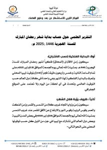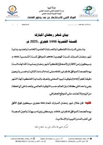 ولادة الهلال ستحدث يوم 28 فبراير في تمام الساعة التاسعة وخمس وأربعين دقيقة صباحًا بتوقيت ليبيا، وأنه سيكون مرئيًا بوضوح بعد غروب الشمس و سيكون فوق الأفق يوم الجمعة 28 فبراير 2025.