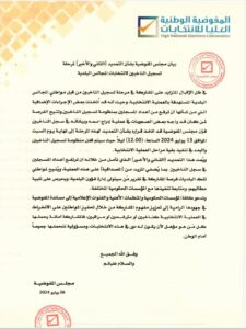 وفي سياق متصل، أكدت المفوضية الوطنية العليا للانتخابات انه تم تمديد مرحلة تسجيل المصوتين في انتخابات المجالس البلدية للمرة الثانية حتى منتصف ليل السبت الموافق 13 يوليو الجاري لرفع أعداد المسجلين بالمنظومة، وإتاحة فرصة جديدة لمن واجه بعض الصعوبات في عملية إدراج اسمه وبياناته في سجل الناخبين.
