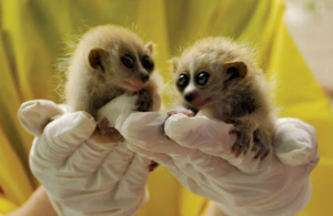 لوريس بطيء قزم ( Nycticebus pygmaeus ) في أيدي عالم أحياء خلال جلسة وزن صباحية في Moody Gardens، وهو مركز طبيعي في جالفستون، تكساس.